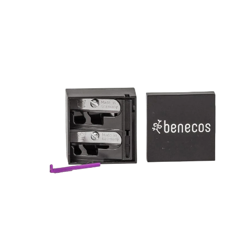 Temperówka kosmetyczna z dwoma ostrzami o różnych rozmiarach, z pojemniczkiem. W zestawie posiada specjalny patyczek do czyszczenia.