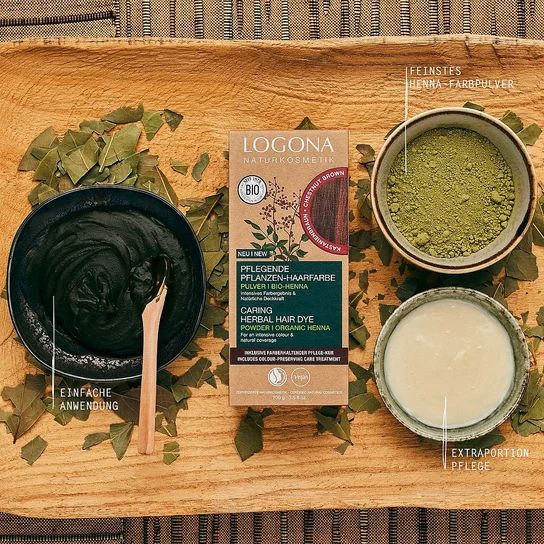 Odżywcze farby roślinne LOGONA nadają włosom intensywny, naturalny kolor ze zdrowym, naturalnym promiennym połyskiem. Wszystkie farby posiadają certyfikat NATRUE i zawierają najczystsze, naturalnie składniki koloryzujące, które zapewniają włosom intensywny kolor. Wysokiej jakości, wegańska formuła farb zawiera organiczną hennę, organiczne indygo i inne czysto naturalne składniki roślinne, w zależności od odcienia farby.